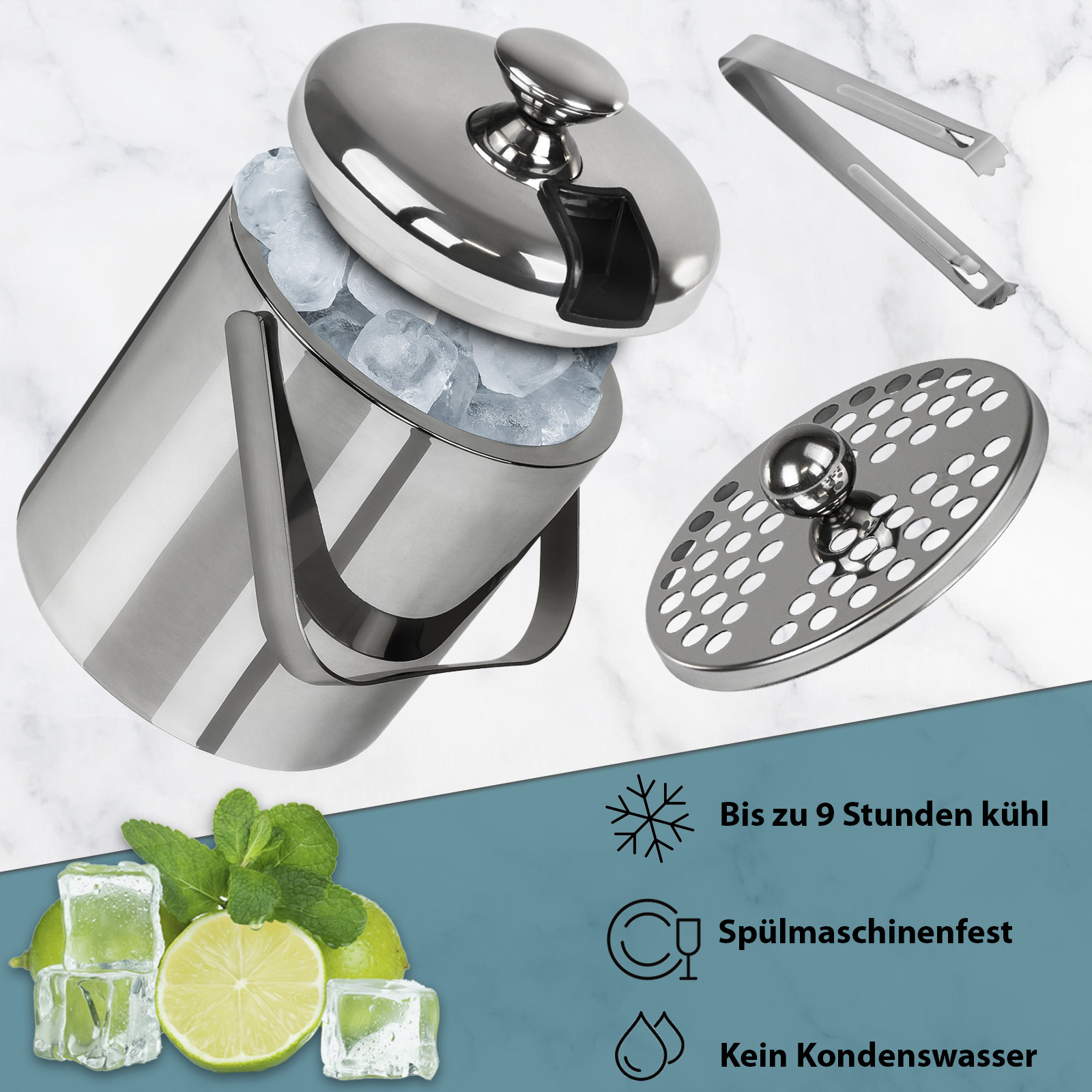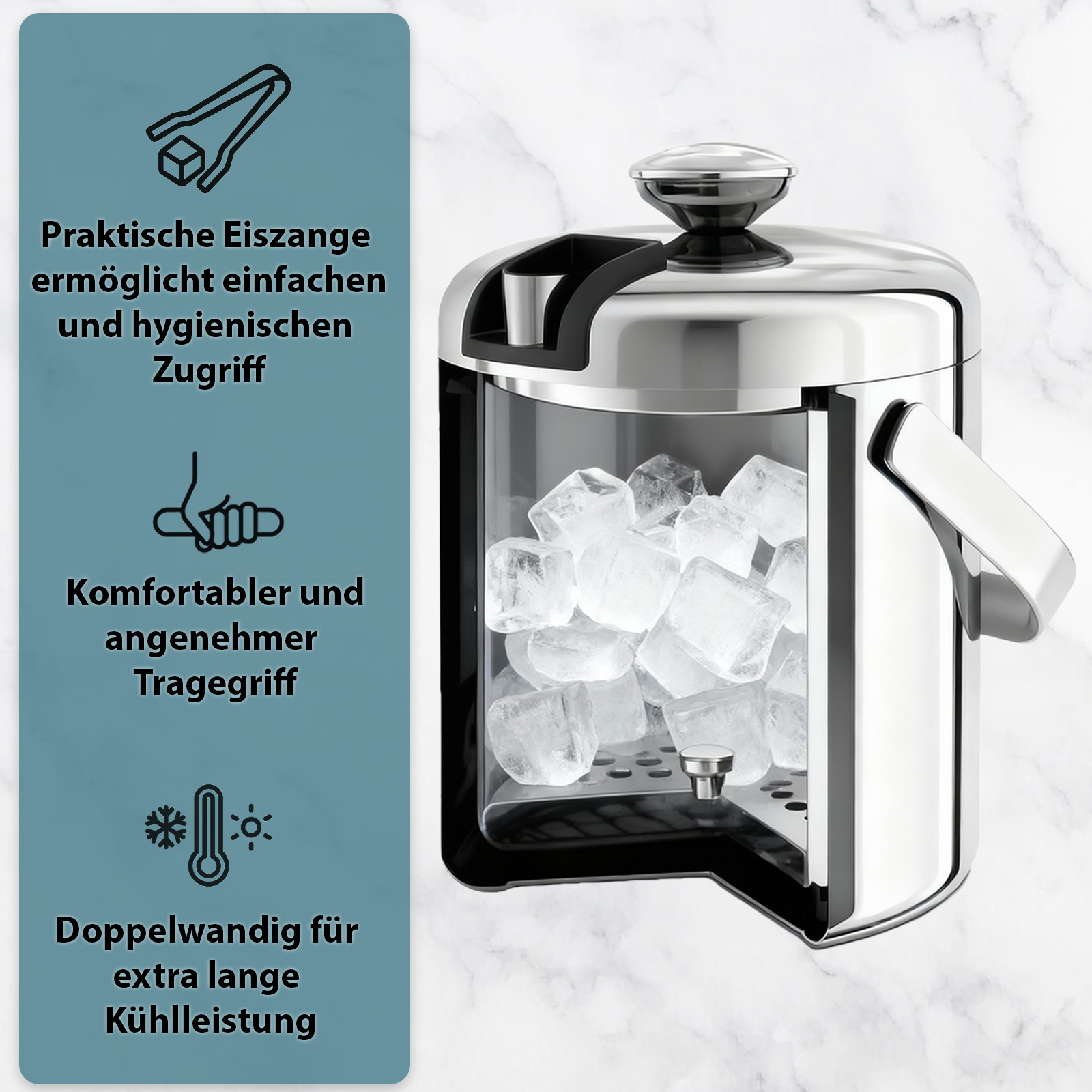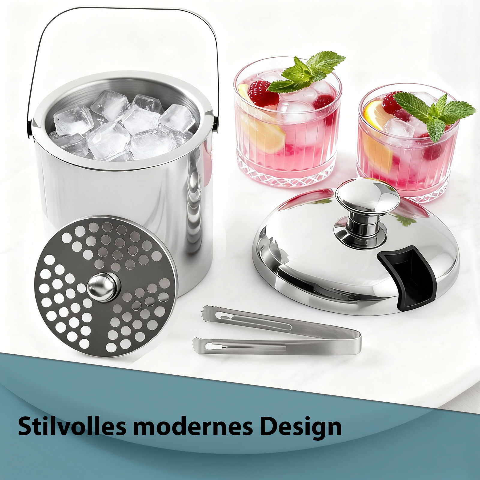 With a capacity of 1.3 litres, it offers enough space for ice cubes for several drinks, yet remains compact and easy to handle. The double-walled construction of the container and lid ensures that the ice cubes stay cool for a particularly long time, while the outer surface always remains dry. The shiny stainless steel is not only a visual highlight, but also impresses with its hygienic, easy-care and corrosion-resistant surface. The container is also well designed in terms of handling: the swivelling carrying handle makes transport pleasantly easy, while the removable ice water strainer reliably separates melted water from the ice – so the cubes retain their shape and freshness for longer. The lid also features a practical opening in which the included tongs can be stored hygienically and kept handy at all times.