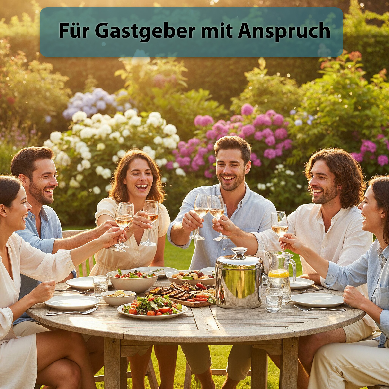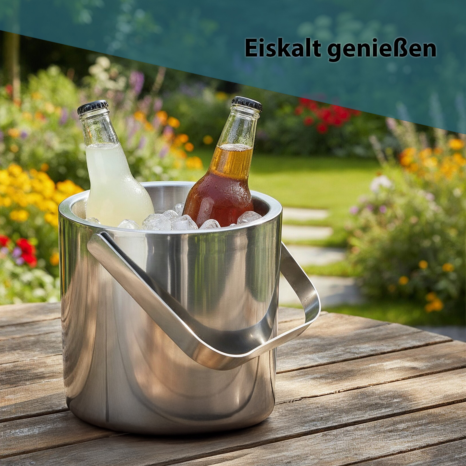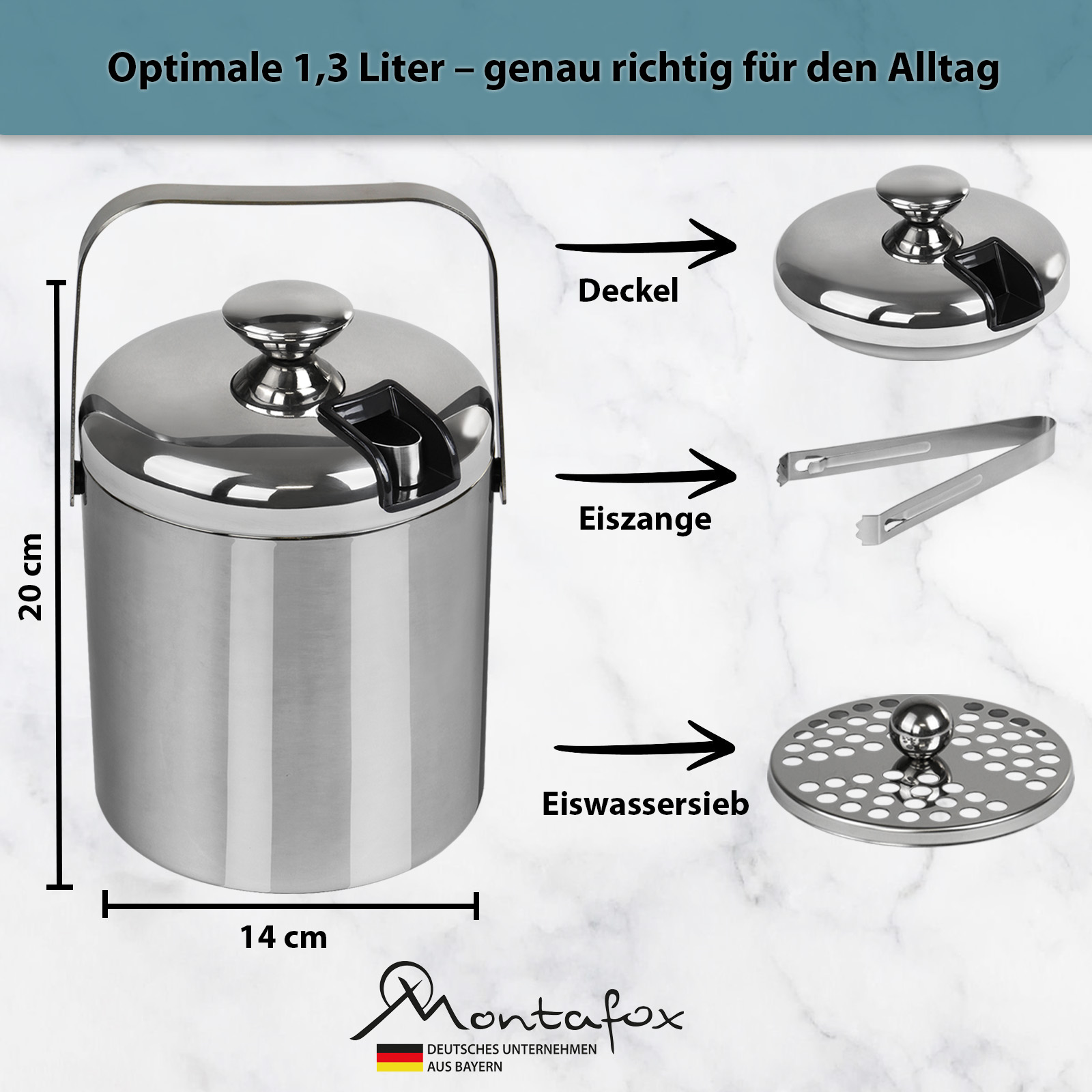 With a capacity of 1.3 litres, it offers enough space for ice cubes for several drinks, yet remains compact and easy to handle. The double-walled construction of the container and lid ensures that the ice cubes stay cool for a particularly long time, while the outer surface always remains dry. The shiny stainless steel is not only a visual highlight, but also impresses with its hygienic, easy-care and corrosion-resistant surface. The container is also well designed in terms of handling: the swivelling carrying handle makes transport pleasantly easy, while the removable ice water strainer reliably separates melted water from the ice – so the cubes retain their shape and freshness for longer. The lid also features a practical opening in which the included tongs can be stored hygienically and kept handy at all times.