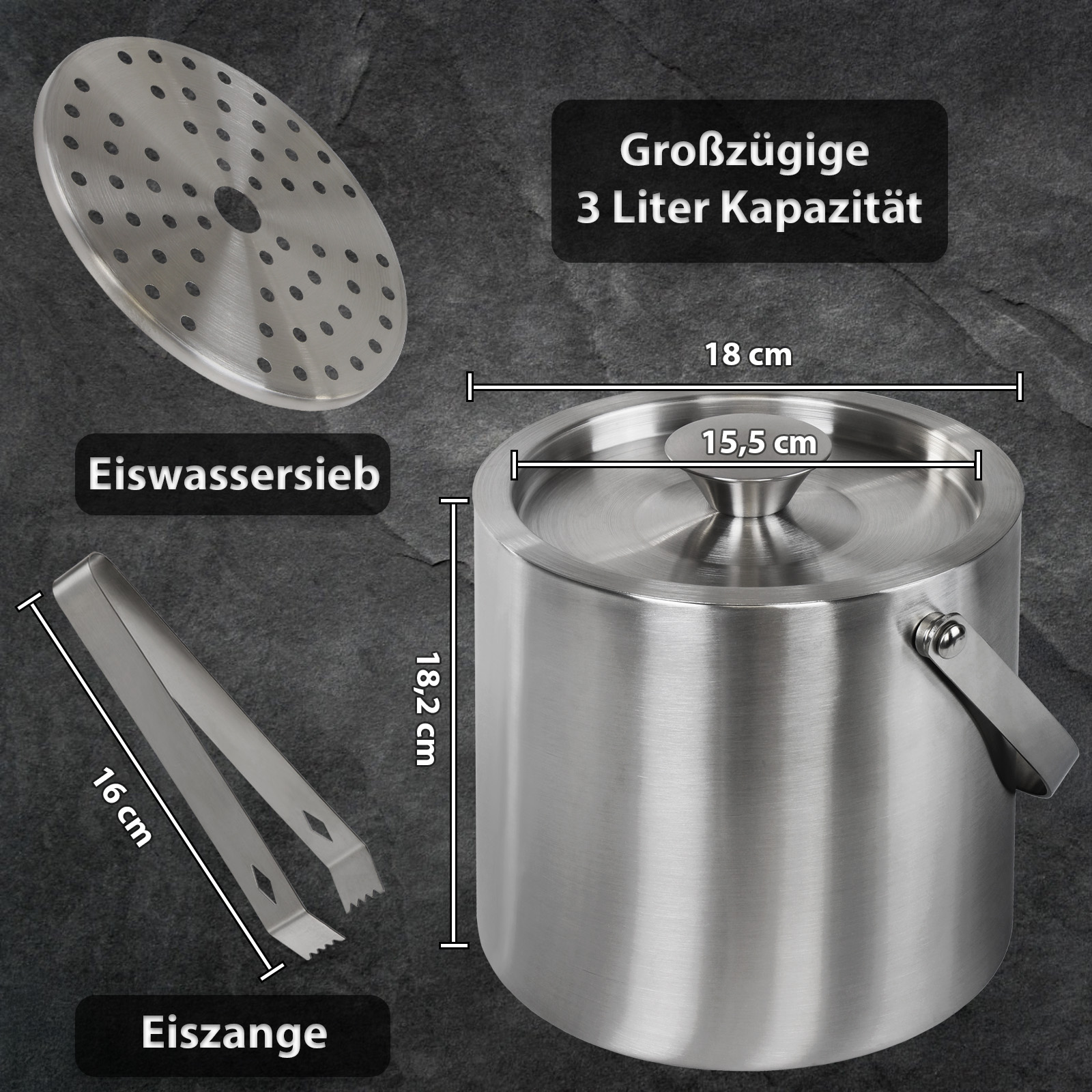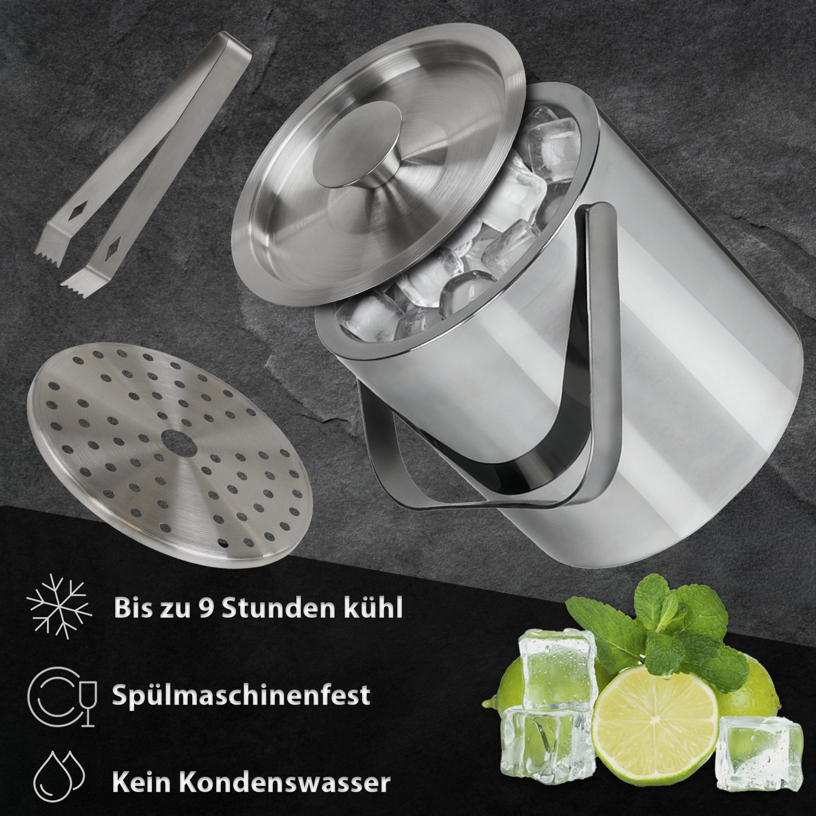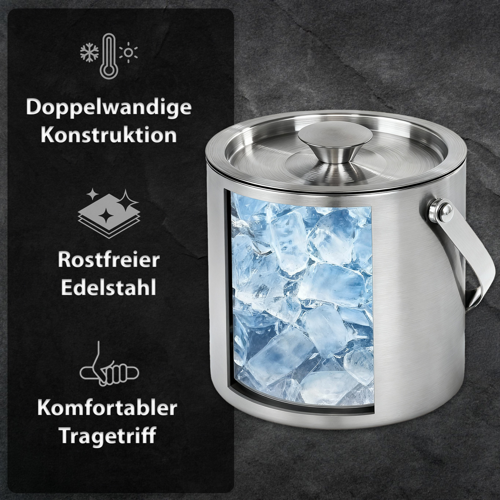 With a capacity of 3 litres, it offers enough space to prepare ice cubes and serve drinks effectively chilled. The double-walled construction ensures that the ice cubes stay cold longer, while the outer surface remains dry and free of condensation. The swivelling carrying handle fits comfortably in the hand and makes it easy to transport the container. An integrated ice water strainer reliably separates melted water from the ice, so that the ice cubes stay in shape longer. A perfectly fitting lid additionally protects the ice from contamination.