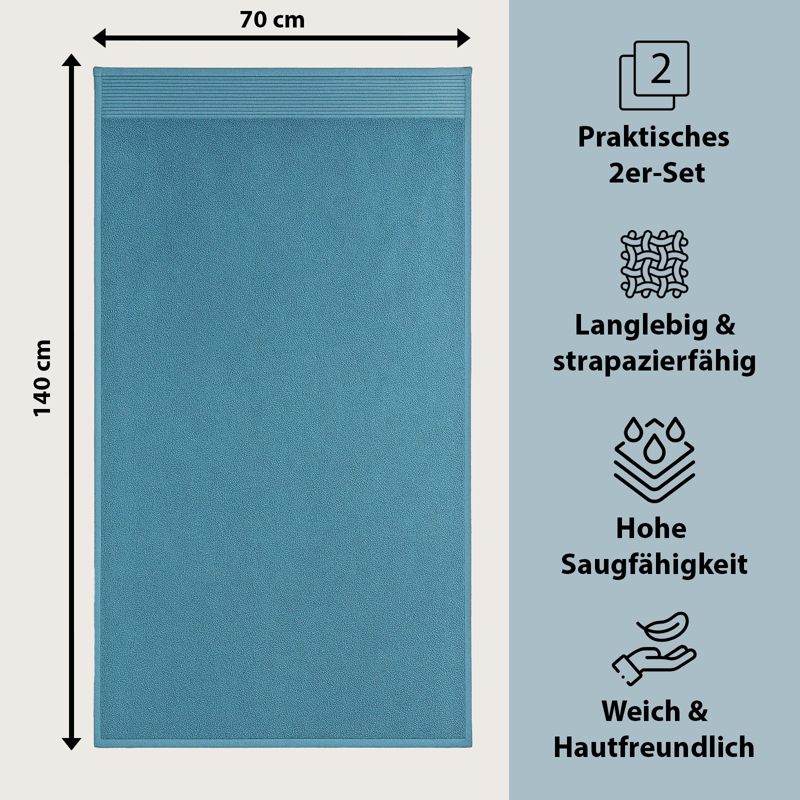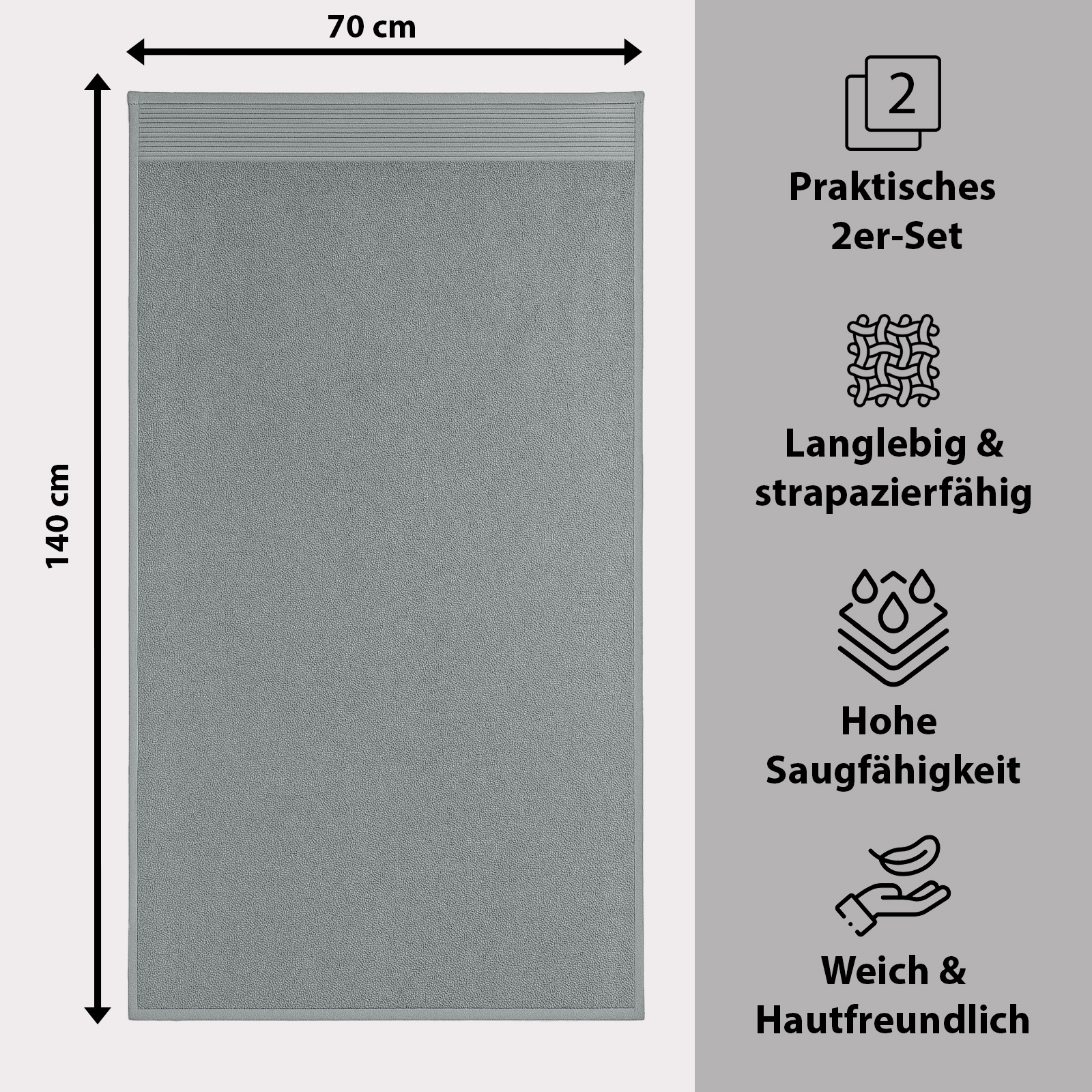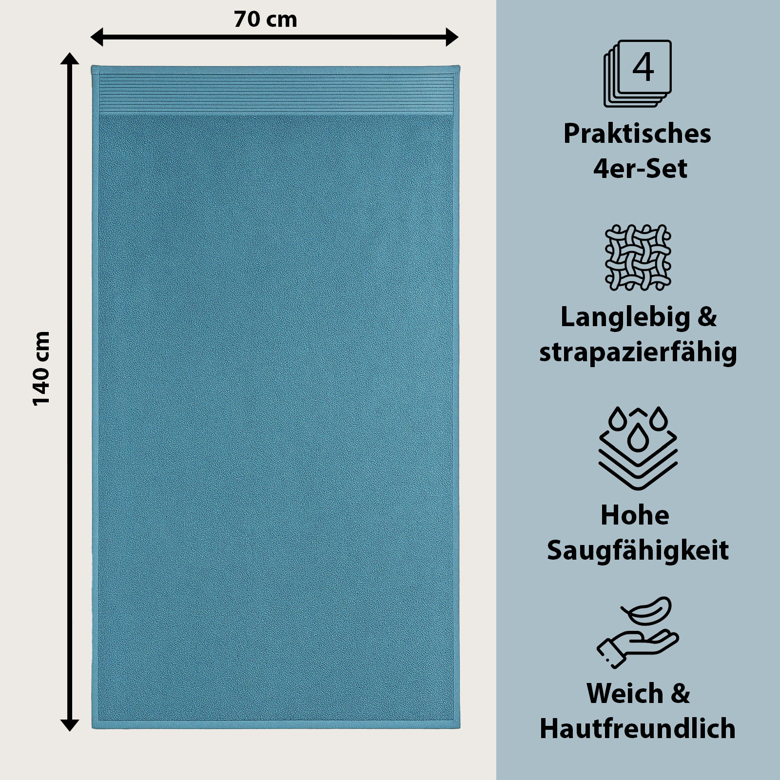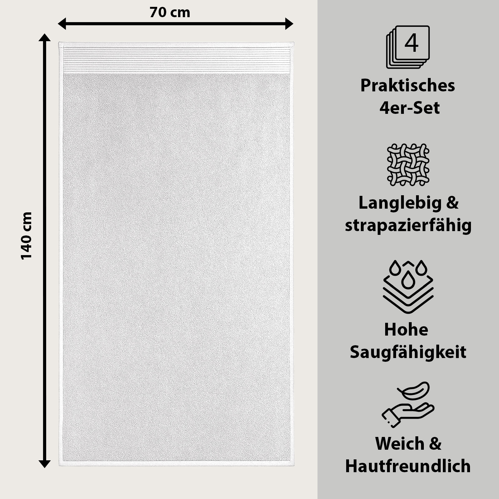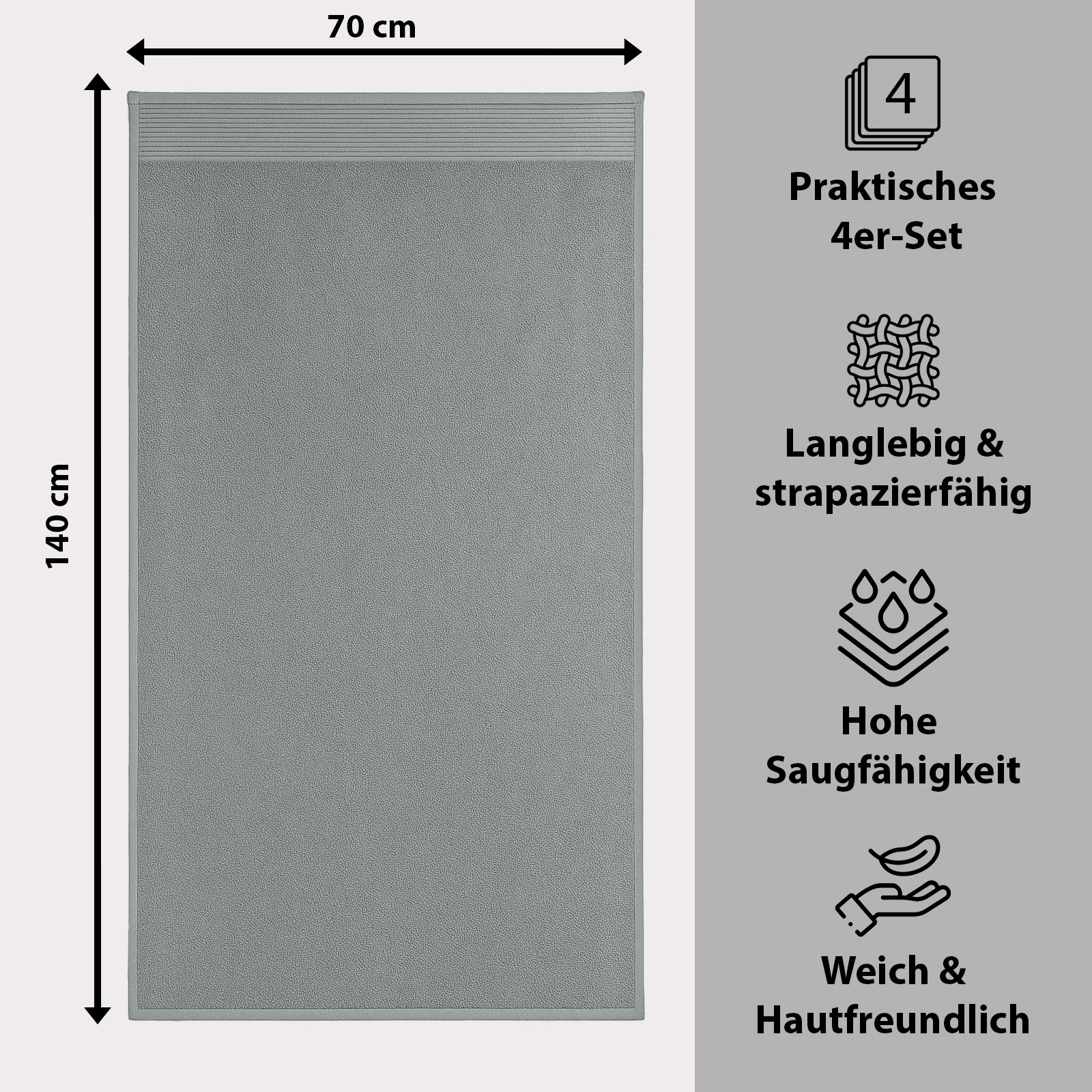 I colori eleganti - bianco classico, grigio moderno, petrolio fresco e prugna raffinato - si adattano a qualsiasi bagno e conferiscono al vostro bagno un tocco di eleganza senza tempo e accenti freschi. Pratico e versatile, è un asciugamano indispensabile per la vita quotidiana, la sauna o la spiaggia.