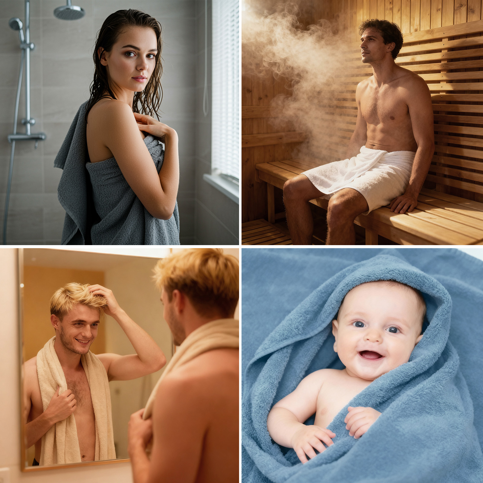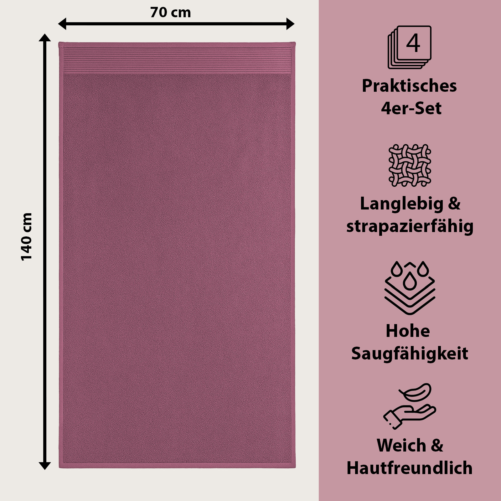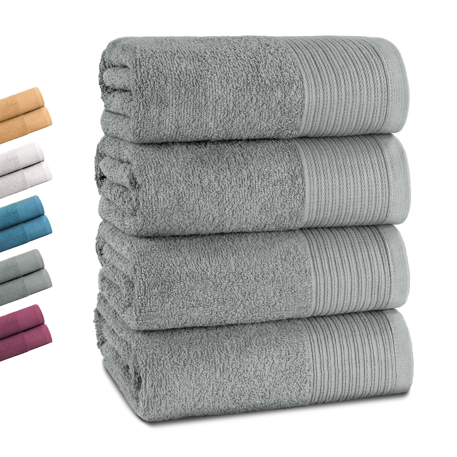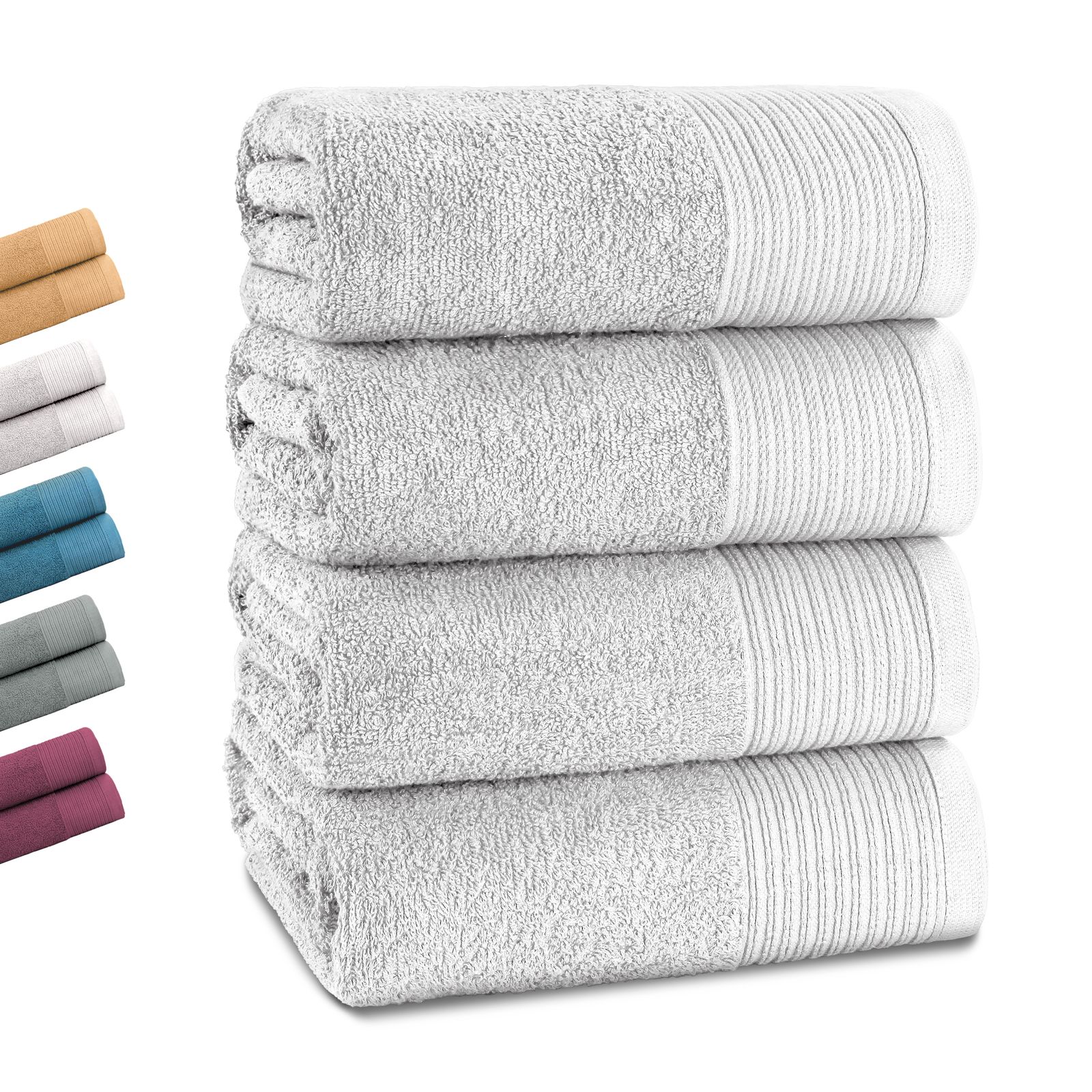 I colori eleganti - bianco classico, grigio moderno, petrolio fresco e prugna raffinato - si adattano a qualsiasi bagno e conferiscono al vostro bagno un tocco di eleganza senza tempo e accenti freschi. Pratico e versatile, è un asciugamano indispensabile per la vita quotidiana, la sauna o la spiaggia.