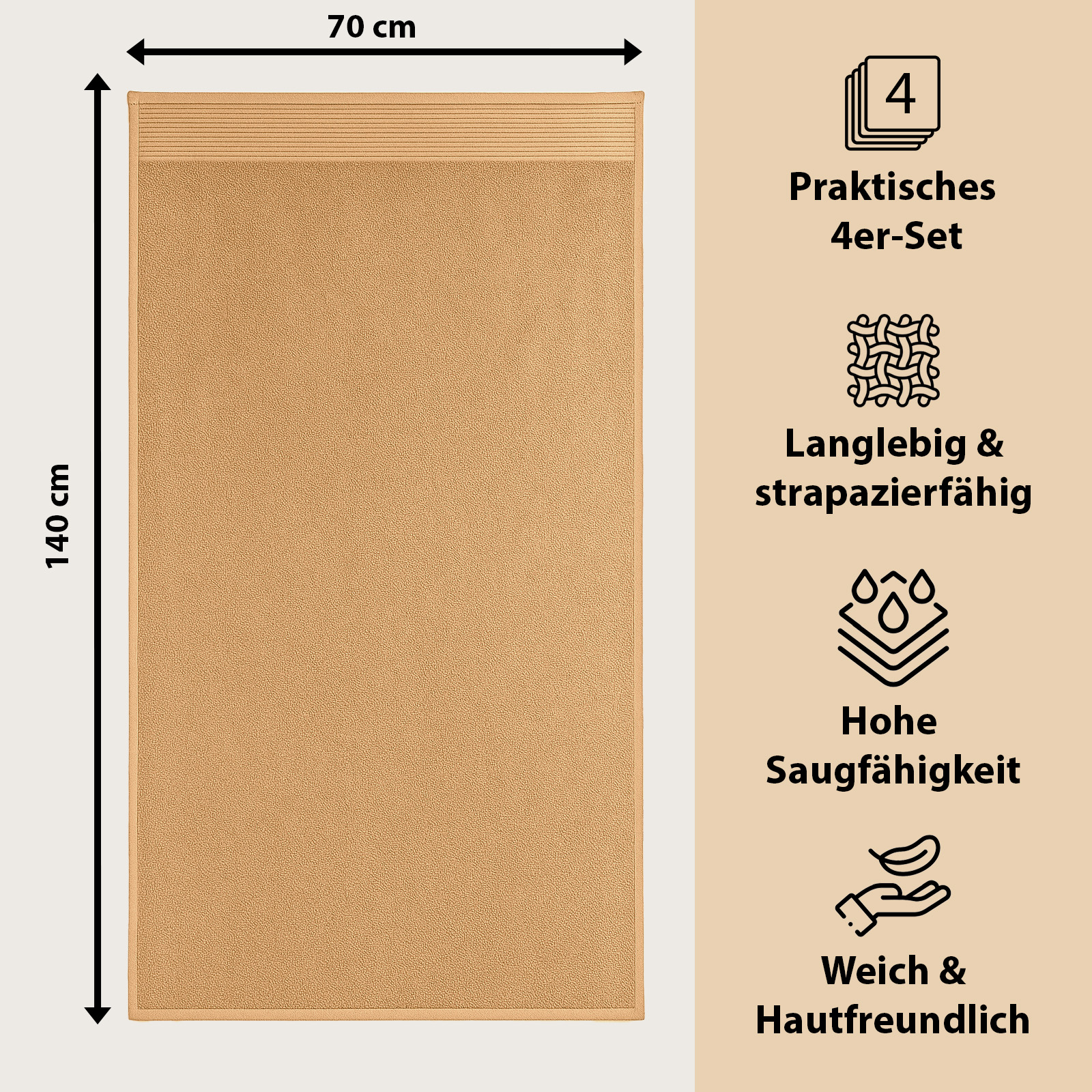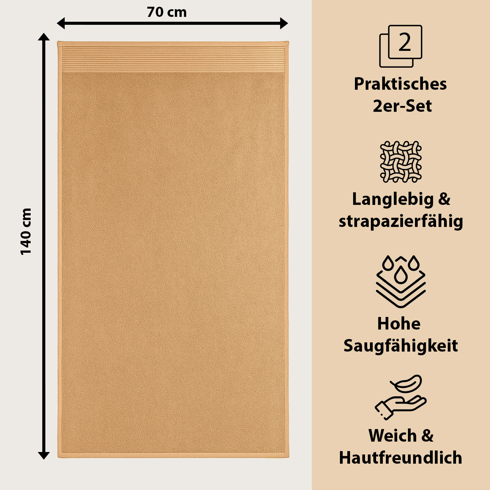 Il nostro asciugamano da doccia di alta qualità unisce comfort, eleganza e versatilità in un unico prodotto. Realizzato in morbido cotone ring-spun, avvolge delicatamente la pelle, assorbe efficacemente l'umidità e garantisce un'asciugatura rapida, per farti sentire completamente a tuo agio dopo ogni doccia. Le dimensioni di 140 x 70 cm lo rendono perfetto per ogni occasione: abbastanza maneggevole per l'uso quotidiano, ma abbastanza grande per asciugarsi comodamente o avvolgersi in un abbraccio.