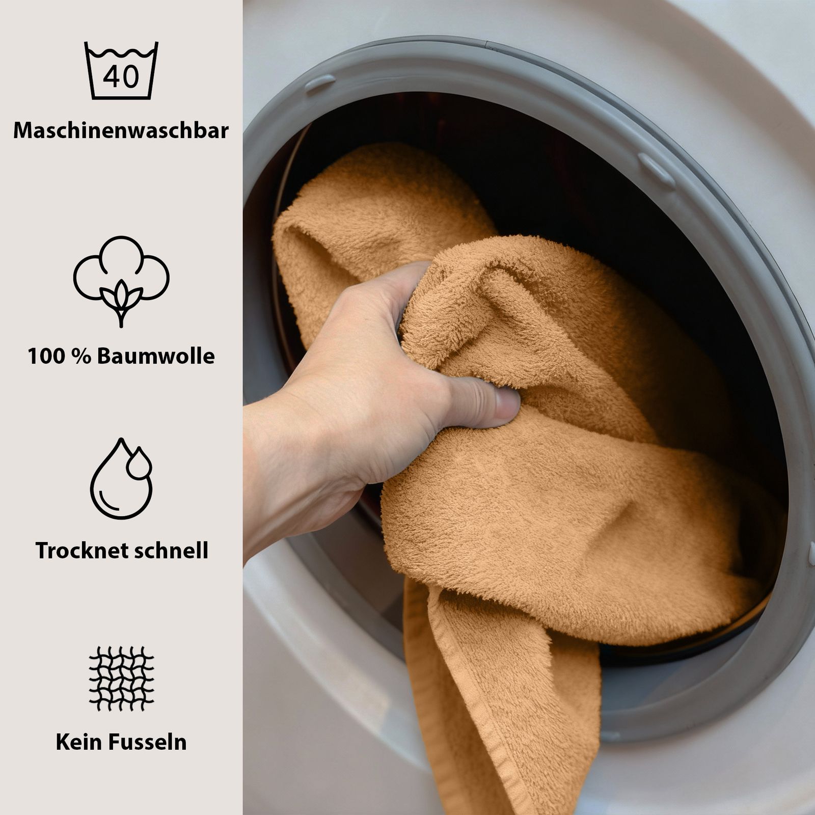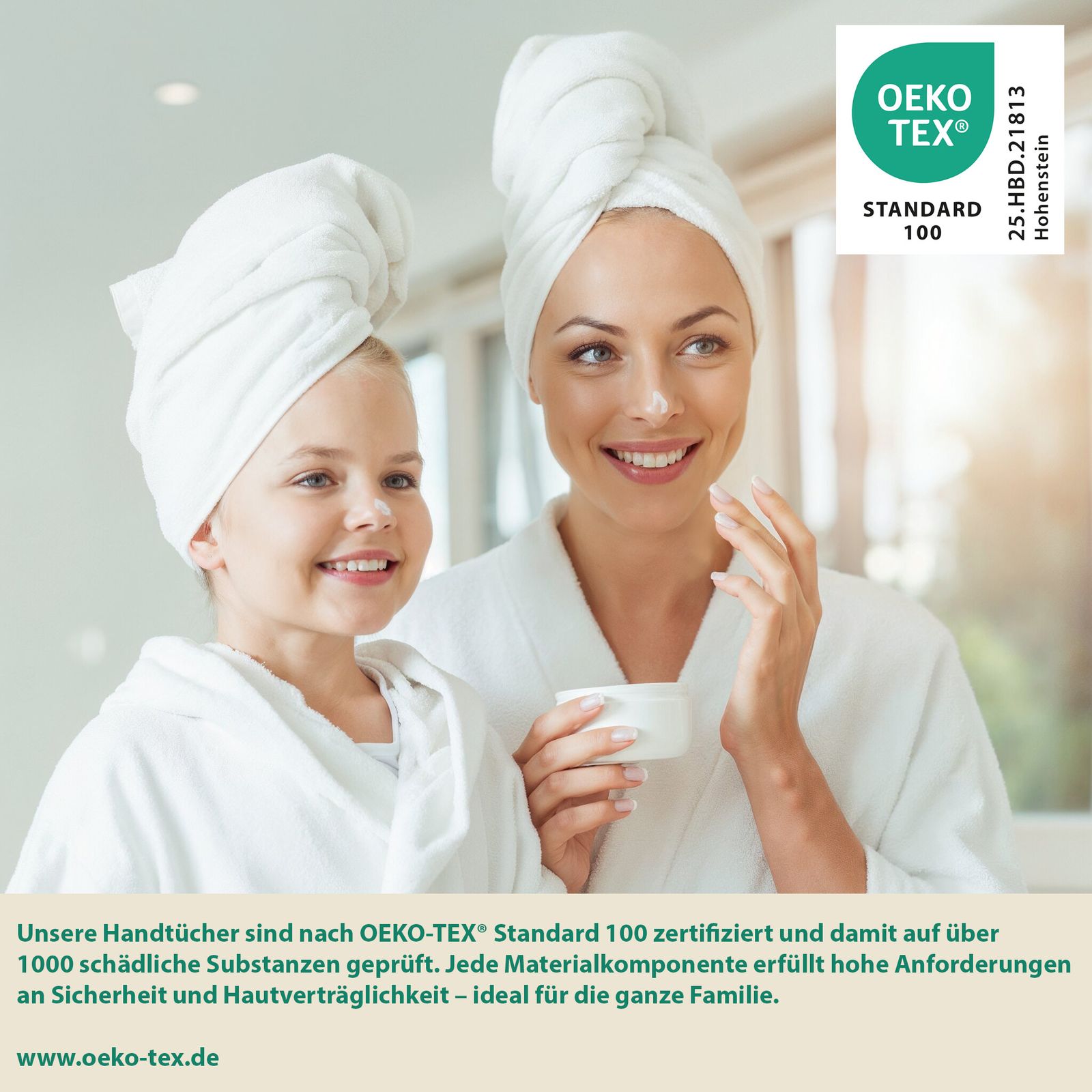 L'orlo doppio sottolinea la lavorazione di alta qualità e rende l'asciugamano da doccia particolarmente resistente. Grazie alla certificazione STANDARD 100 by OEKO-TEX® (certificato n° 25.HBD.21813, istituto Hohenstein), il materiale è privo di sostanze nocive e particolarmente delicato sulla pelle, ideale anche per le pelli sensibili.