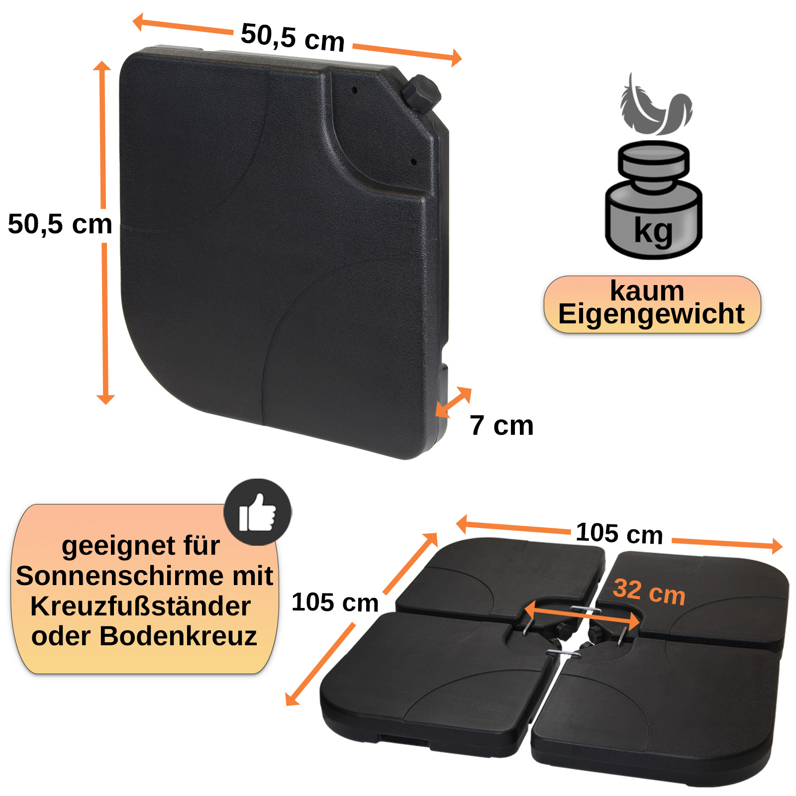 Sono composte da 4 elementi, ciascuno dei quali dispone di capacità pari a 15 litri. Facile da riempire, è possibile riempire ogni pezzo attraverso i bocchettoni laterali. La maniera più semplice per riempire la base è l'utilizzo di un imbuto o innaffiatoio Al posto dell'acqua, è possibile anche zavorrare le piastre con la sabbia.