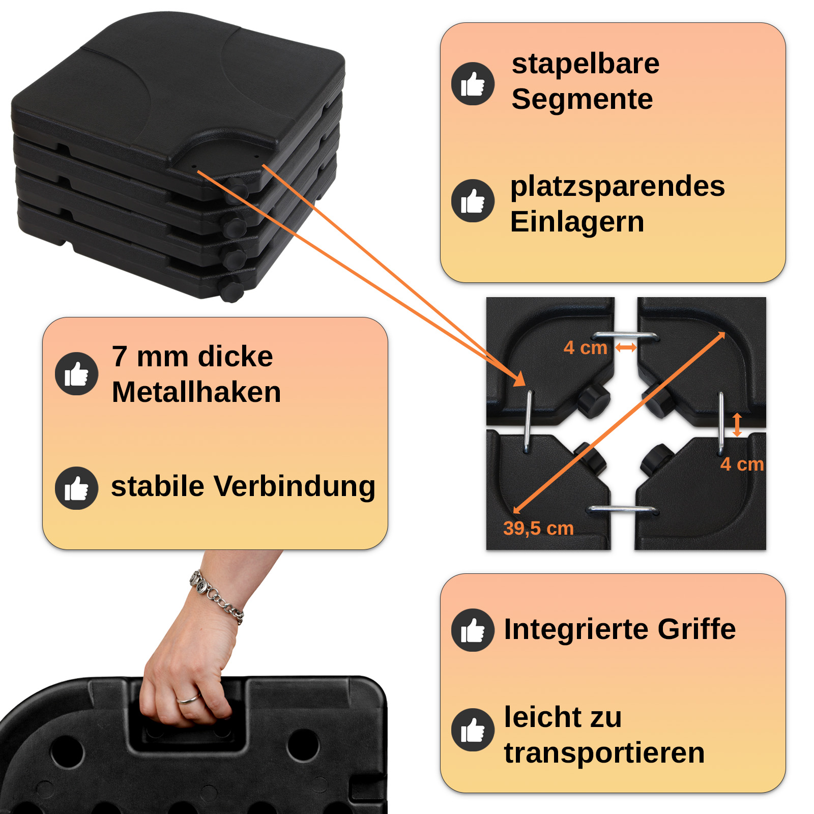 Attraverso ganci di metallo di 7 mm di spessore le singole piastre della base vengono fissate le une alle altre La plastica, resistente agli agenti atmosferici, è robusta, liscia, con angoli tutti arrotondati. Quando è il momento di mettere via la base nella stagione invernale, i quattro segmenti possono essere prontamente impilati uno sull'altro, senza alcuna fatica, e riposti in cantina o nella rimessa da giardino Anche il trasporto è reso agevole dalle maniglie integrate.